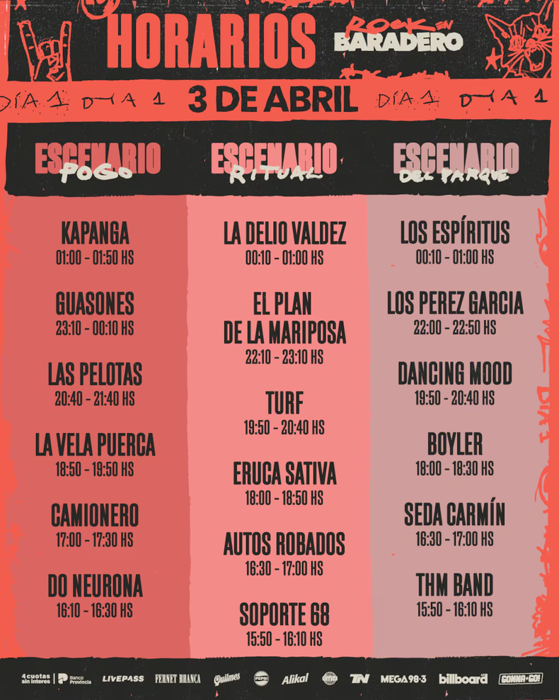 Y para completar una programación estarán Los Pérez García, Los Tabaleros, Camionero, Autos Robados, Kill Flora, Terapia, Seda Carmin, Boyler y Juan Baro.