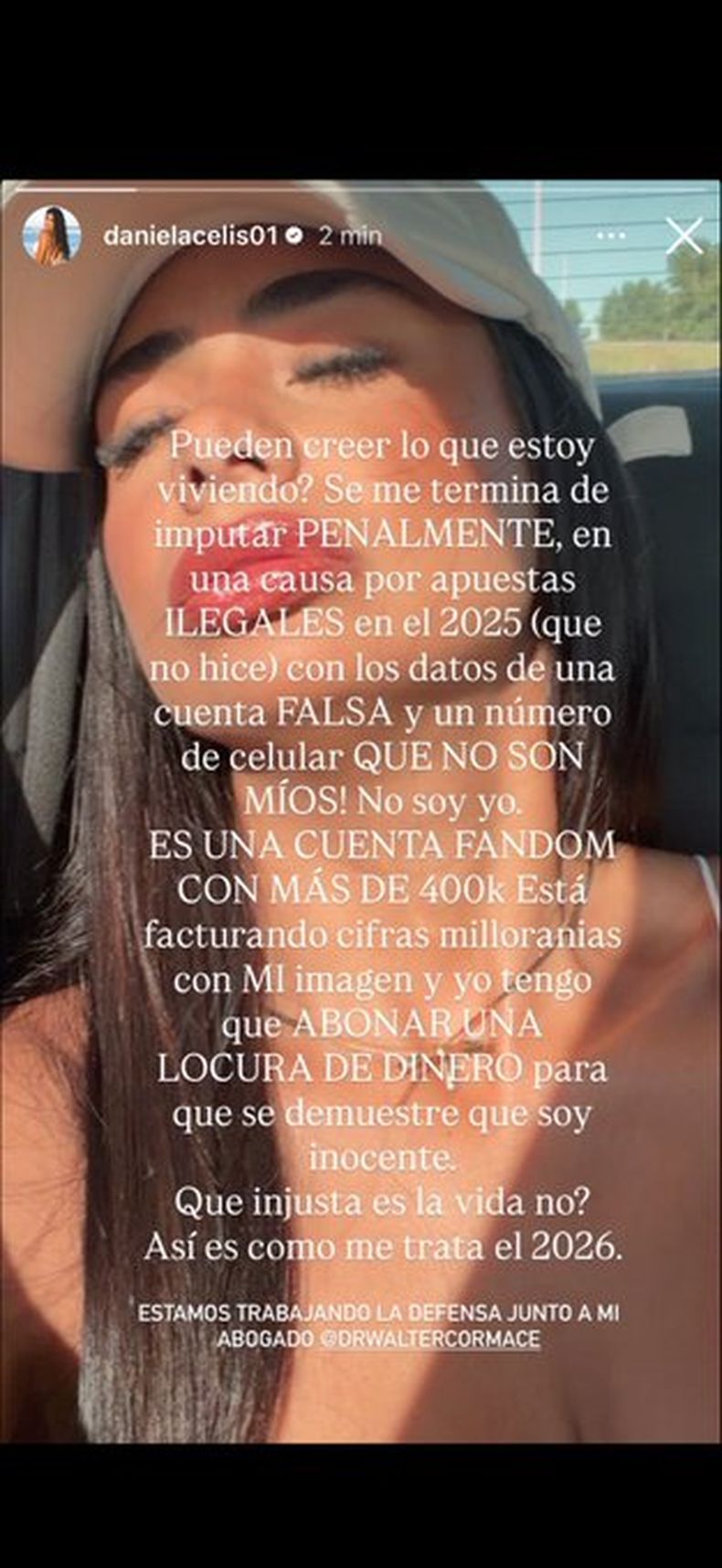 Daniela Celis contó en sus redes el drama que está viviendo tras ser imputada penalmente por la Justicia. La ex Gran Hermano salió a explicar la situación y contar su propia versión de los hechos. Además, aclaró que el tema está en manos de sus abogados.