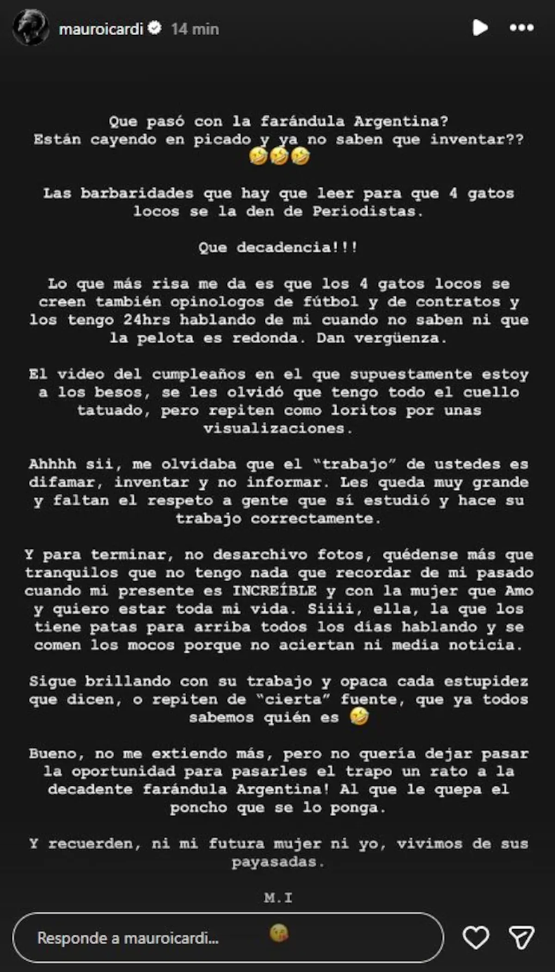 Además, sin nombrar a su ex y madre de sus hijos, Wanda Nara, aclaró respecto a unas imágenes del pasado junto a ella que volvieron a aparecer en su feed de Instagram y dejó una frase lapidaria: “No desarchivo fotos. Quédense tranquilos que no tengo nada que recordar de mi pasado cuando mi presente es increíble y con la mujer que amo, y quiero estar toda mi vida”.