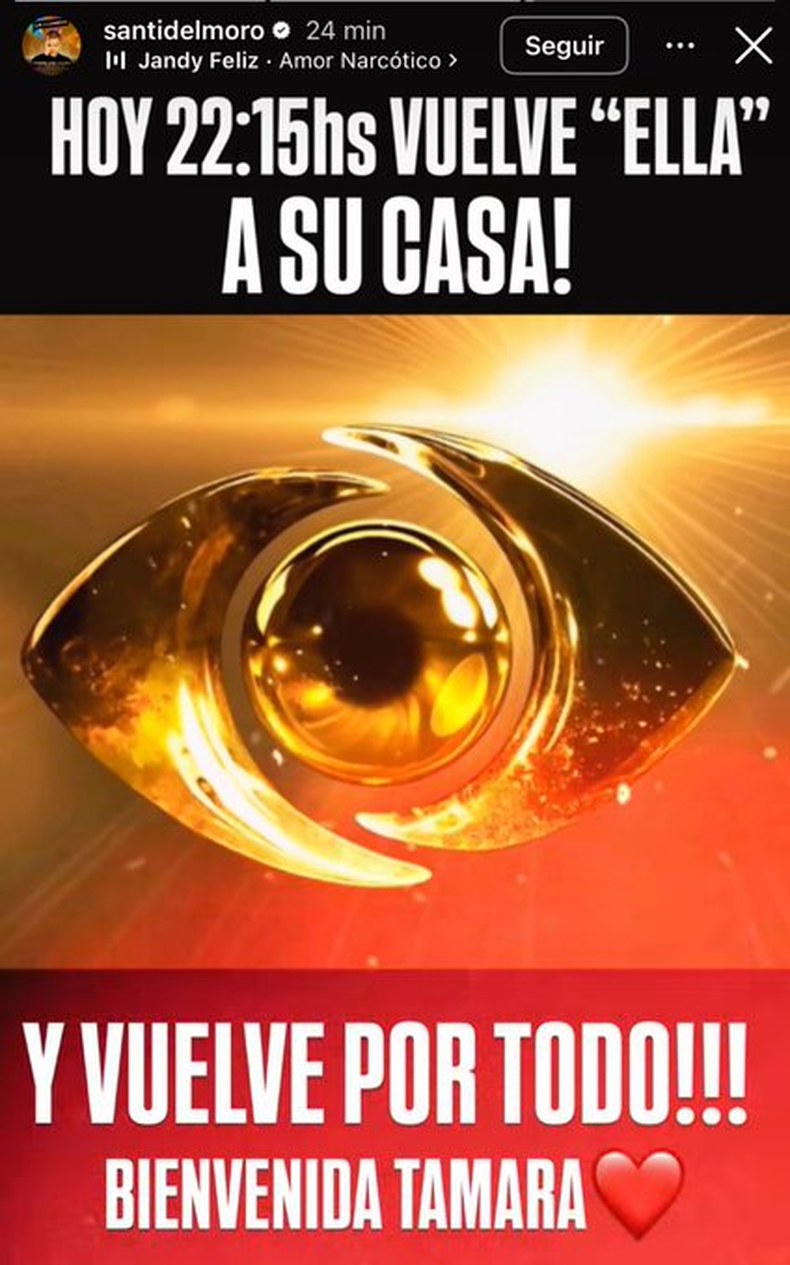 La noticia fue confirmada por Santiago del Moro a través de las redes sociales. "Hoy 22.25hs vuelve ella a su casa... y vuelve por todo. Bienvenida Tamara", escribió el animador en sus historias de Instagram.