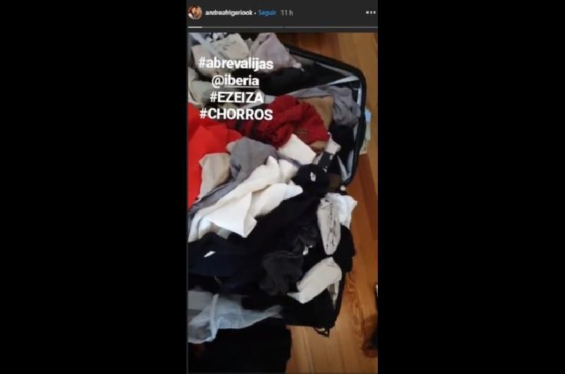 “Abrevalijas, Iberia, Ezeiza chorros”, escribió en su cuenta de Instagram, que tiene 143 mil seguidores, junto a una foto de la valija violentada y toda revuelta.