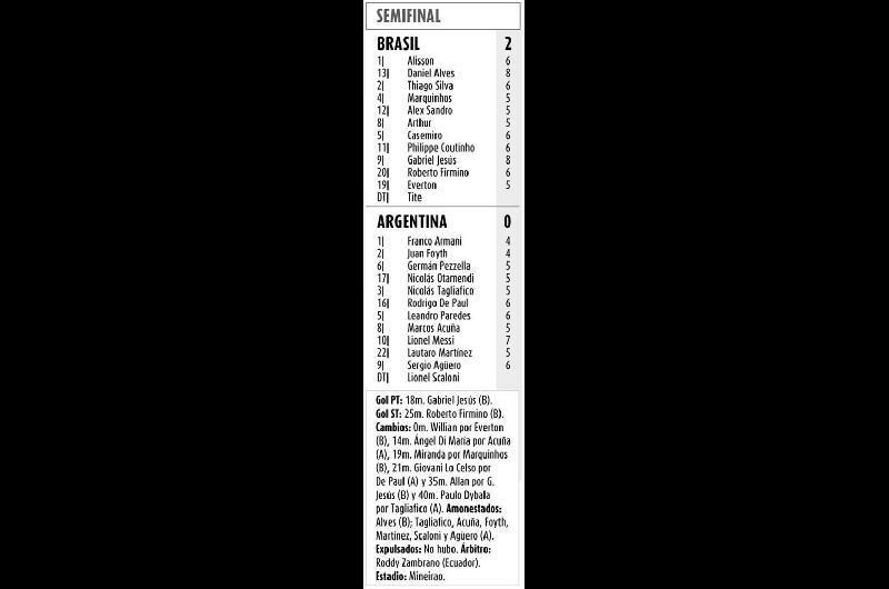 No hubo forma de vulnerar el arco de Alisson -hasta acá invicto-, las energías no eran las mismas y Brasil descansó en los últimos minutos final. Los errores arbitrales (penales a Otamendi y Agüero) y el gol de Firmino fueron letales. Brasil es el que jugará la final.