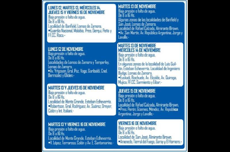 La empresa estatal Aguas y Saneamientos Argentinos (AySA) publicó un cronograma de inconvenientes en el servicio a raíz de tareas de mantenimiento de la red en Lomas, Esteban Echeverría y Almirante Brown.