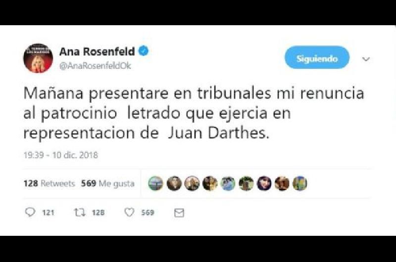 La abogada Ana Rosenfeld anunció vía Twitter que hoy se presentará en Tribunales para renunciar al patrocinio que ejercía hasta ahora en representación del actor Juan Darthés.