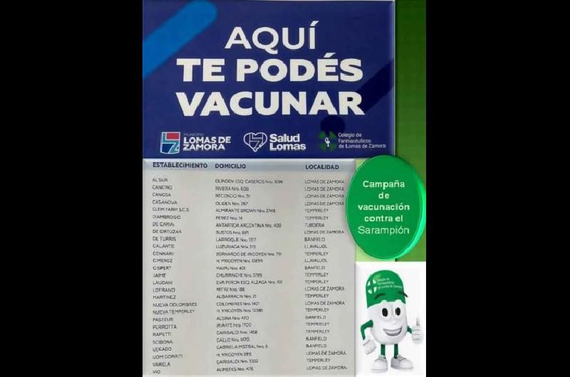 La aplicación de dicha vacuna esta disponible en forma totalmente gratuita en distintas farmacias del partido de Lomas de Zamora como así también en todos los centros médicos y vacunatorios municipales.