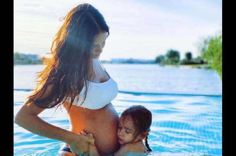 La modelo y conductora compartió una tierna foto luciendo su panza, abrazada por su hija Malaik, mientras ambas comparten un rato en la pile.