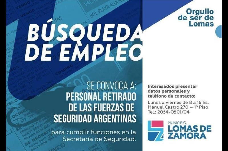 La Oficina de Empleo del Municipio continúa con la búsqueda de personal retirado de las fuerzas de seguridad para cumplir funciones en la Secretaría de Seguridad de Lomas de Zamora.