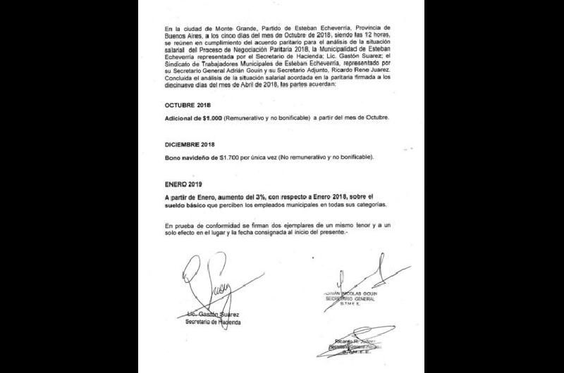 Los trabajadores municipales de Esteban Echeverría llegaron a un acuerdo con el Gobierno municipal y consiguieron un aumento adicional del 3% que se suma al 17% firmado a principios de año y el cobro de un plus de $1000 en octubre y un bono navideño de $1700.