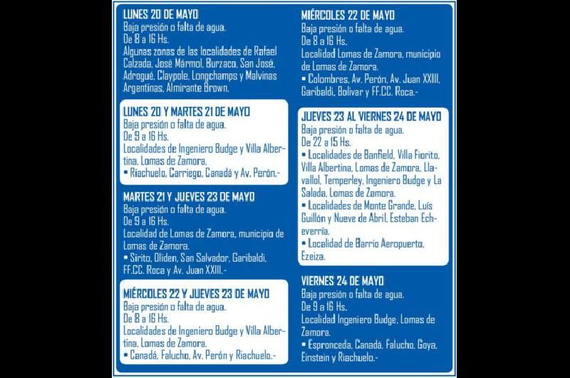 La empresa estatal Aguas y Saneamientos Argentinos publicó un cronograma de inconvenientes en el servicio a raíz de tareas de mantenimiento de la red en Lomas, Brown, Ezeiza y Echeverría para la próxima semana.