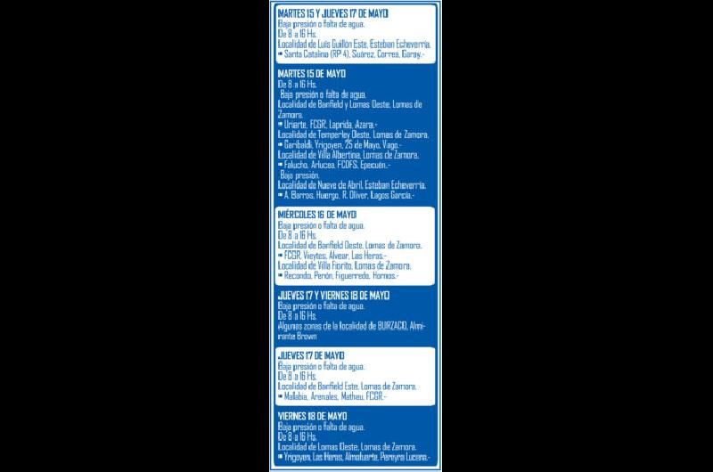 AySA informó que por tareas de mantenimiento, habrá cortes o baja presión de agua la próxima semana en Banfield Este y Oeste, Lomas Oeste, Temperley Oeste y Albertina.