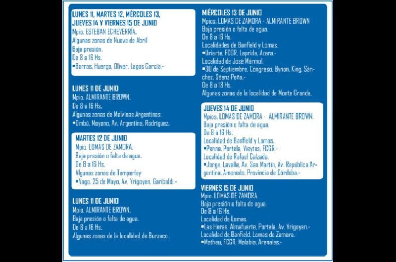 La empresa AySA está haciendo obras de mantenimiento y elaboró un cronograma de zonas donde habrá cortes de agua y/o falta de presión. Zona por zona con sus fechas:
