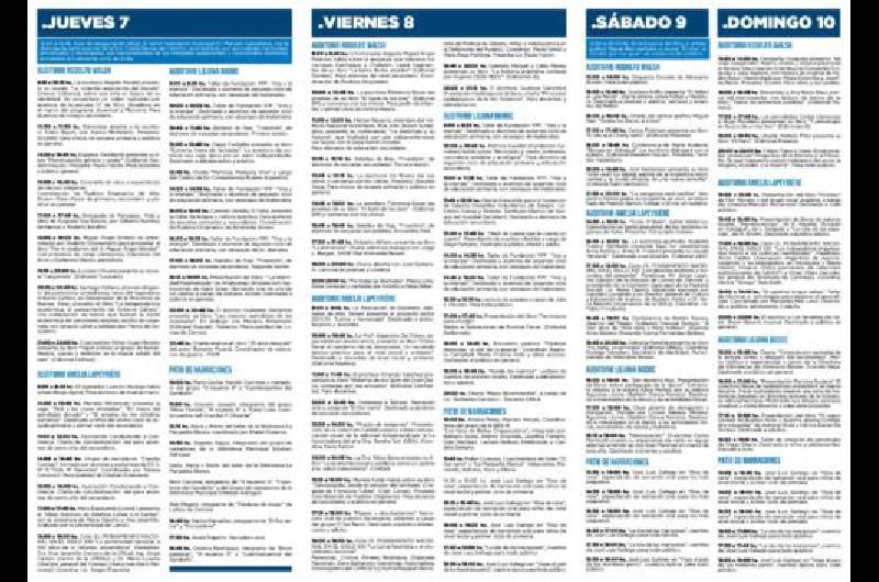 Por la feria pasarán entre hoy y mañana el dibujante Miguel Rep, el periodista José Natanson, el historiador Felipe Pigna y el filósofo Darío Szanjazraiber, y María Kodama que hablará del legado de Jorge Luis Borges.