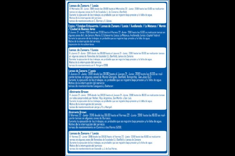 La empresa AySA dio a conocer el cronograma de cortes del suministro, o baja presión, por obras de mantenimiento en Lomas y la región. Los detalles: