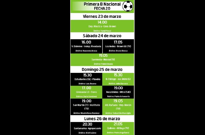 Este martes se sorteó la fecha 20 del torneo de la B Nacional, con días y árbitros designados. En uno de los partidos atractivos de la jornada, Los Andes recibirá el sábado, desde las 17.05, a Brown de Adrogué.