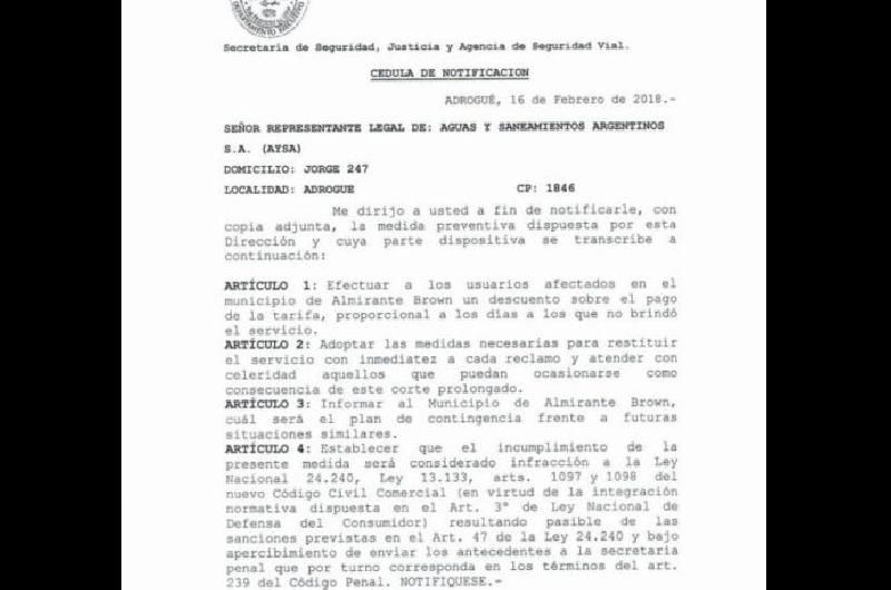 La oficina de Defensa al Consumidor del Municipio de Almirante Brown instó a la empresa Aguas y Saneamientos Argentinos (AySA) a efectuar descuentos en las próximas facturas de aquellos usuarios que sufrieron cortes de agua o baja presión desde principios de esta semana para "remediar la demora provocada en la solución del reclamo".