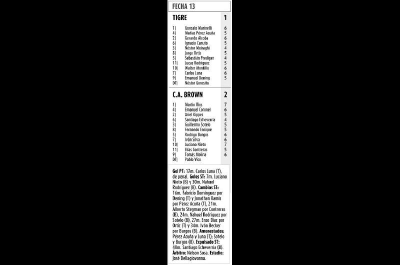 Brown salió con una actitud bien distinta al complemento. Y lo igualó rápido, a los siete minutos. Gran escalada de Coronel, centro que no pudo despejar bien Moiraghi y Nieto le dio con un fierro para romperle el arco a Marinelli. Tigre sintió el impacto y Pipo movió rápido el banco. Pero mejores respuestas tuvo Vico con Stegman y Nahuel Rodríguez.