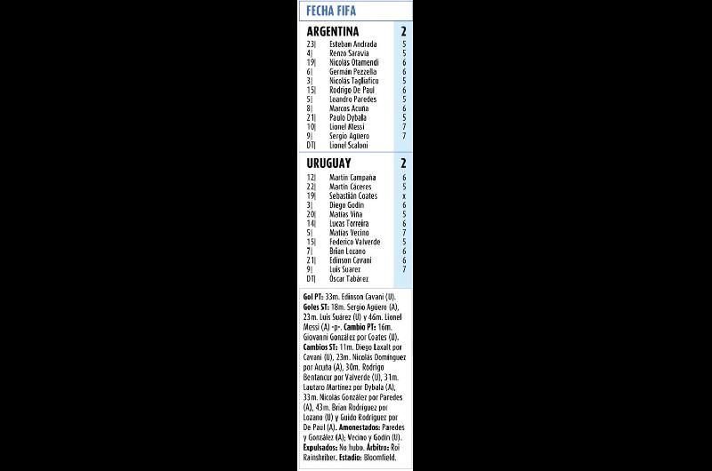 Llegando al final, Campaña le sacó un gran cabezazo a Agüero. Y del córner llegó la mano de Martín Cáceres y el penal sancionado por el israelí Rainshriber. Messi, con un toque suave a la derecha de Campaña puso la igualdad definitiva y merecida.