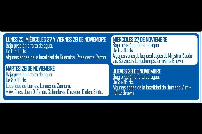 La empresa estatal Aguas y Saneamientos Argentinos publicó un cronograma de inconvenientes en el servicio a raíz de tareas de mantenimiento de la red en Lomas, Almirante Brown y Presidente Perón.