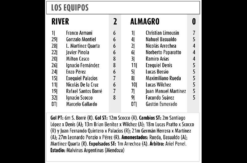 En el arranque del complemento, Arrechea vio la roja al minuto, como si a Almagro le faltarán dificultades y, con paciencia, el Millonario fue edificando el cierre de un triunfo anunciado.