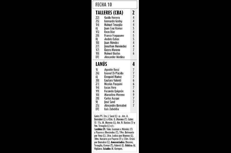 Talleres volvió a arrancar dormido y Moreno cruzó el remate para el tercero a los 11 segundos. Rápido se puso a tiro la T con Bustos, que la acomodó al poste derecho. Pero enseguida Lanús sacó más luz con un gol en contra de Tenaglia, tras un centro de Auzqui.