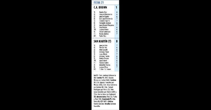 Con un gol de cabeza de Santiago Echeverría, Brown de Adrogué venció a San Martín de Tucumán, líder de la Zona B del Torneo de Primera Nacional, y tomó aire en su lucha por escapar del puesto de descenso. Con este triunfo, el Tricolor llegó los 24 puntos.