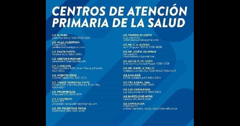 A continuación, la lista de los Centros de Atención Primaria de la Salud de Lomas. También se puede consultar el listado haciendo click acá.