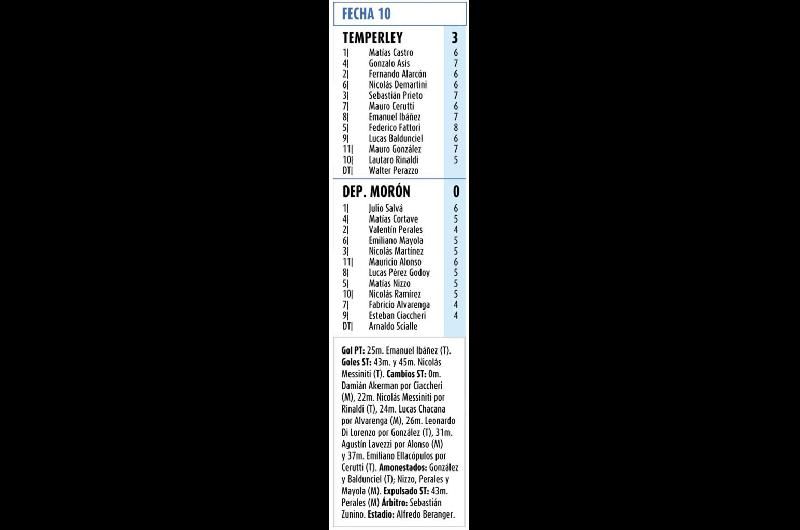 Temperley va. De la mano de Walter Perazzo el equipo ganó en confianza y se anima. En el estadio Beranger, el Gasolero superó una exigente prueba y goleó por 3-0 a Deportivo Morón con un golazo de Emanuel Ibáñez y dos de Nicolás Messiniti sobre el cierre.