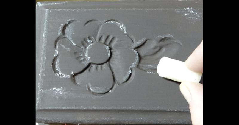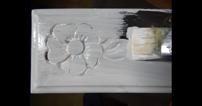 Pasar la vela por todas las aristas y salientes de las molduras para reservar los espacios a decapar. Frotar algunos sectores siguiendo una simulada línea de veta de madera.