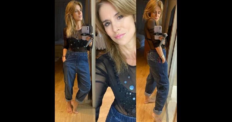 Esta vez la exconductora infantil lució un jean muy de talle grande, con un body negro de transparencia y con brillos, con un corpiño del mismo color debajo.