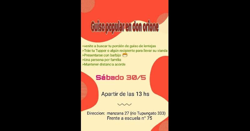 Es fundamental que al lugar concurra una persona por familia con su tupper o recipiente, barbijo y respetando el distanciamiento para cumplir con las medidas sanitarias. Además, se entregarán algunos productos y recibirán donaciones de gente que tenga ganas de acercar alimentos no perecederos.