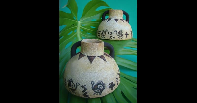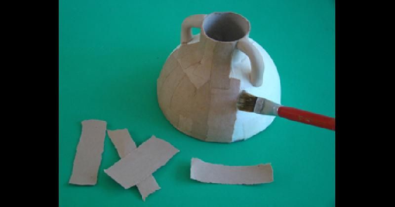 Cortar tiras de papel madera. Pincelas la superficie de la vasija con cola vinílica y realizar una cartapesta adhiriendo el papel, uno al lado de otro, integrando de esta forma el cuerpo de la pieza a la base y boca de cartón. Dejar secar.