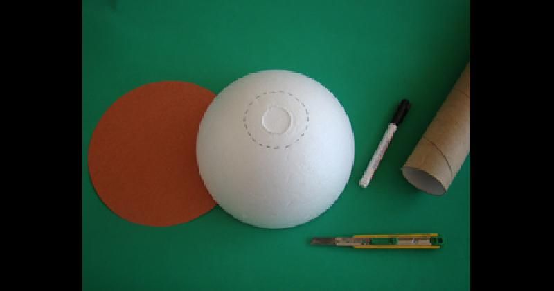 Según el tamaño deseado para la vasija, seleccionar la semiesfera de telgopor y el tubo de cartón de un diámetro acorde. Marcar este diámetro en el centro de la semiesfera y calar con el cúter. Cortar un cartón con el mismo diámetro de la semiesfera, para formar la base de la vasija.