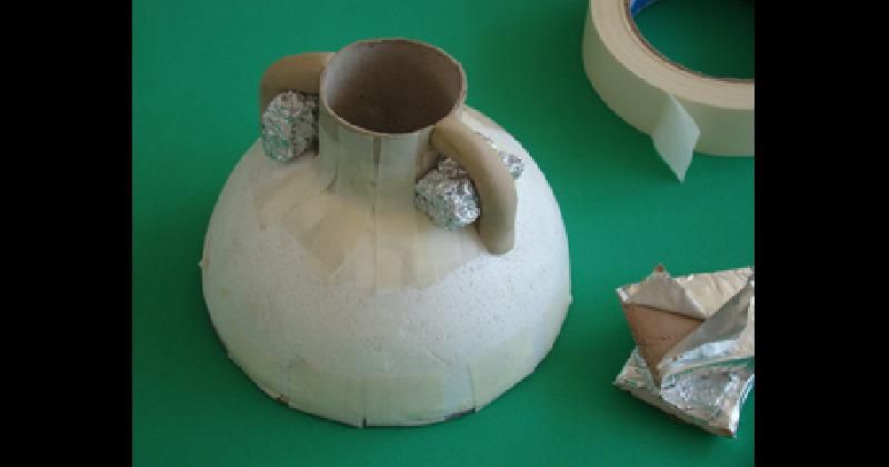 Insertar el tubo de cartón en el espacio calado dejando sobresalir lo que será la boca de la vasija. Sujetar con cinta de enmascarar. Sostener de igual forma la base de cartón. Modelar las asas con masilla epoxi y colocar en el interior rollos de papel metalizado hasta que fragüen en su posición.