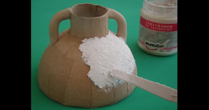 Con la ayuda de una esteca recubrir la vasija con el Texturador de Superficies Monitor. Aplicarlo en forma pareja, alisándolo con la esteca, exceptuando las asas. Dejar secar. La pieza quedará bien rígida, con apariencia de piedra.