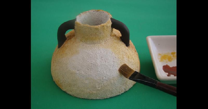 Para dar color, pintar las asas con acrílico marrón africano. Con una aguada de amarillo imperio pintar desde la boca hacia abajo, intensificando el color cerca de las asas y en la base. Acentuar con toques de chocolate. Dejar secar.