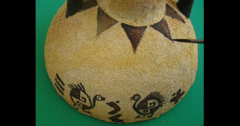 Con un pincel redondo fino y marrón africano, delinear a mano alzada diseños indígenas o de fantasía, a elección. Rellenar algunos espacios de los mismos con la pintura aguada para que corra bien el pincel sobre la textura, e iluminar algunos sectores con chocolate.