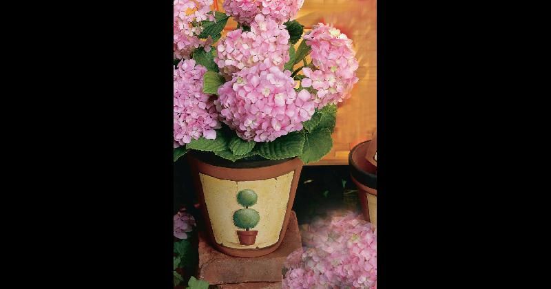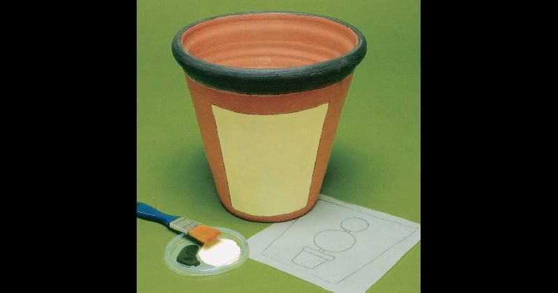 Transferir sobre la maceta el contorno de la etiqueta y pintar con blanco + pizca de amarillo de cadmio. Con verde oscuro, pintar el borde superior de la maceta. Dejar secar y calcar el topiario en el centro de la etiqueta.