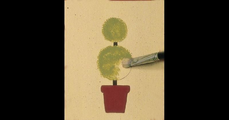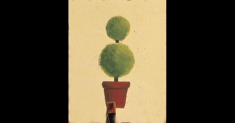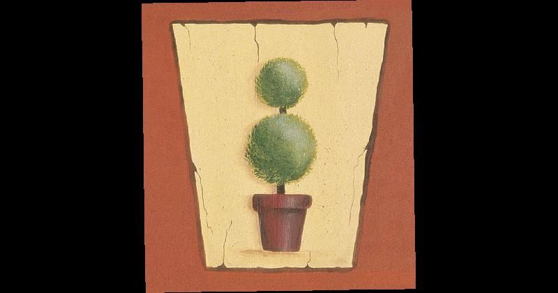 Con un pincel gastado realizar un salpicado con tierra sombra natural sobre la etiqueta. Pintar la maceta del topiario con rojo óxido y los troncos con sombra natural. Para realizar el follaje cargar un pincel de cerdas gastadas con verde claro, y descargarlo con golpecitos circulares sobre las copas del árbol.
