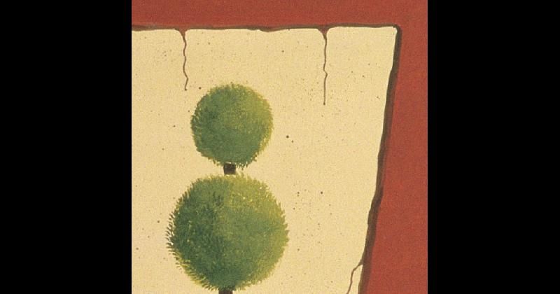 Cargar el pincel de cerda con un poco de blanco e iluminar las copas de los árboles sobre los bordes opuestos a la sombra. Del mismo modo, iluminar la maceta, marcando una línea de luz vertical. Dejar secar. Para despegar el diseño del fondo, oscurecer con sombra natural diluida todo el costado en sombra de la figura y base de apoyo. Dejar secar y proteger con barniz.