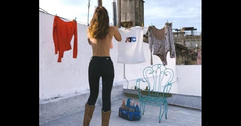 En la siguiente se muestra en topless y de espaldas mientras cuelga la ropa en su terraza, con un cajón de soda de fo