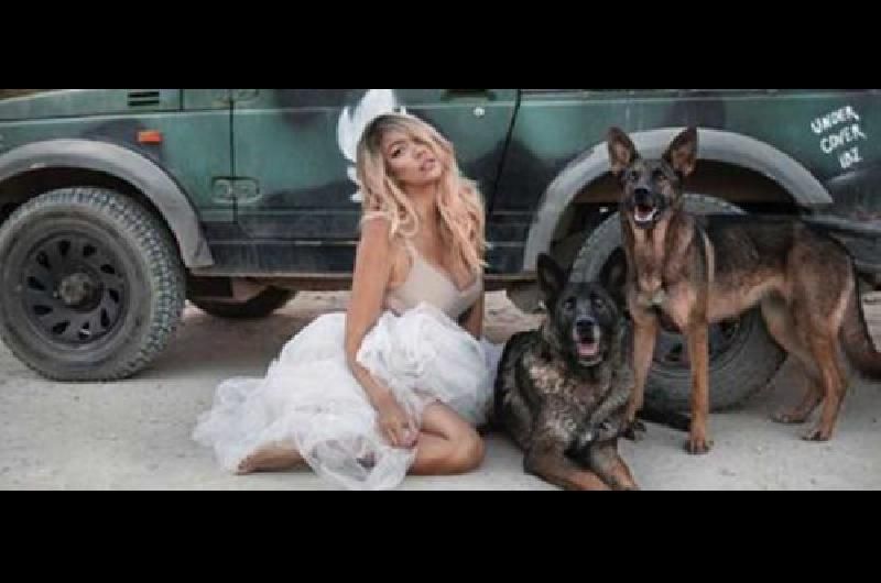 Wanda Nara protagonizó una sesión fotográfica con un par de perros y con un jeep verde de fondo.
