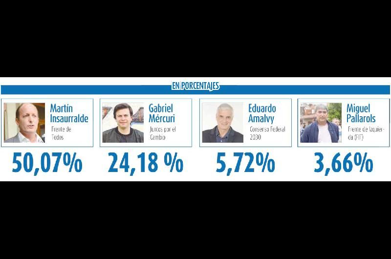 OTROS NÚMEROS. El sello Juntos por el Cambio, que tiene a Gabriel Mércuri como candidato a intendente, tuvo el 24,18% de los votos. Mientras que Consenso Federal 2030, cuyo postulante a jefe comunal es Eduardo Amalvy, logró un 5,72%. Miguel Pallarols, candidato del Frente de Izquierda y de los Trabajadores (FIT), alcanzó el 3,66%. Al cierre de esta edición, el Frente Nos, Movimento Avanzando Socialista (MAS), Partido Humanista, Partido Renovador Federal, Dignidad Popular y Movimiento Organización Democrática no llegaron al 1,5% de los votos por lo que no podrán competir en las generales de octubre.