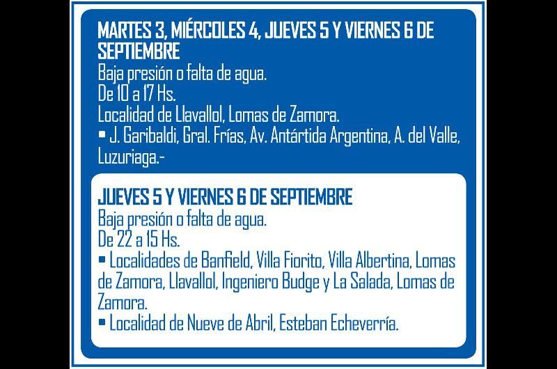 La empresa estatal Aguas y Saneamientos Argentinos publicó un cronograma de inconvenientes en el servicio a raíz de tareas de mantenimiento de la red en Lomas y Echeverría.