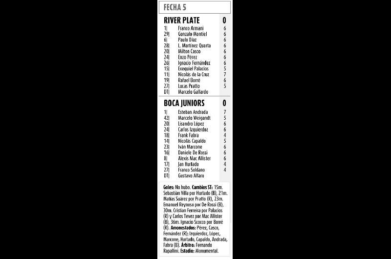 Propuso más River, fue más dinámico, vertiginoso, pero sin resolución en los metros finales. Lo poco que probó lo resolvió sin problemas Andrada. Boca cumplió en la faz defensiva, con Marcone y De Rossi siendo ruedas de auxilio para los centrales, pero desteñido arriba con Hurtado y Soldano.