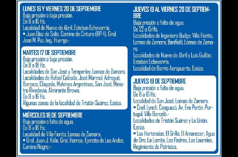 La empresa estatal Aguas y Saneamientos Argentinos publicó un cronograma de inconvenientes en el servicio a raíz de tareas de mantenimiento de la red en Lomas, Ezeiza, Esteban Echeverría y Almirante Brown.