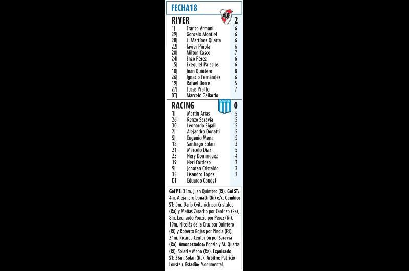 River se quedó con el clásico de la 18° fecha de la Superliga Argentina de Fútbol, al vencer al puntero Racing por 2-0 en el estadio Monumental. La Academia podría ser alcanzada este lunes por Defensa y Justicia (si vence a Argentinos), en la cima de la tabla de posiciones.