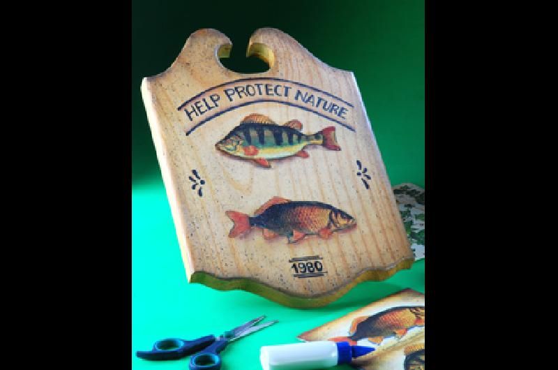Sobre una madera natural, la técnica de decoupage, eligiendo figuras que no pierden su colorido.