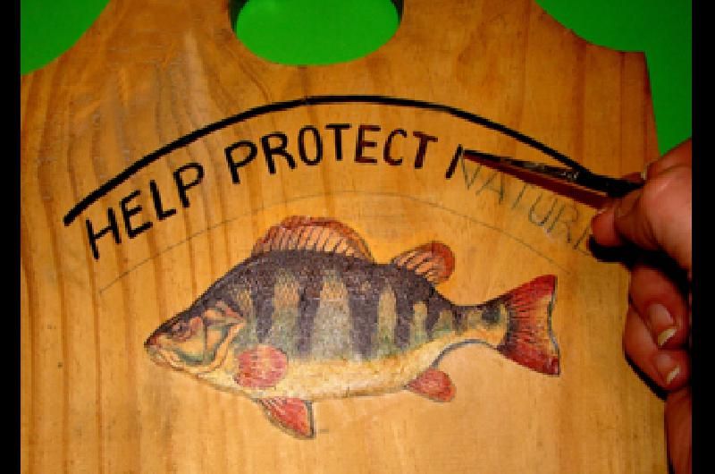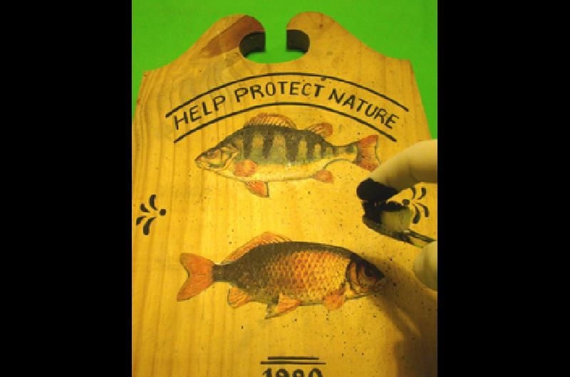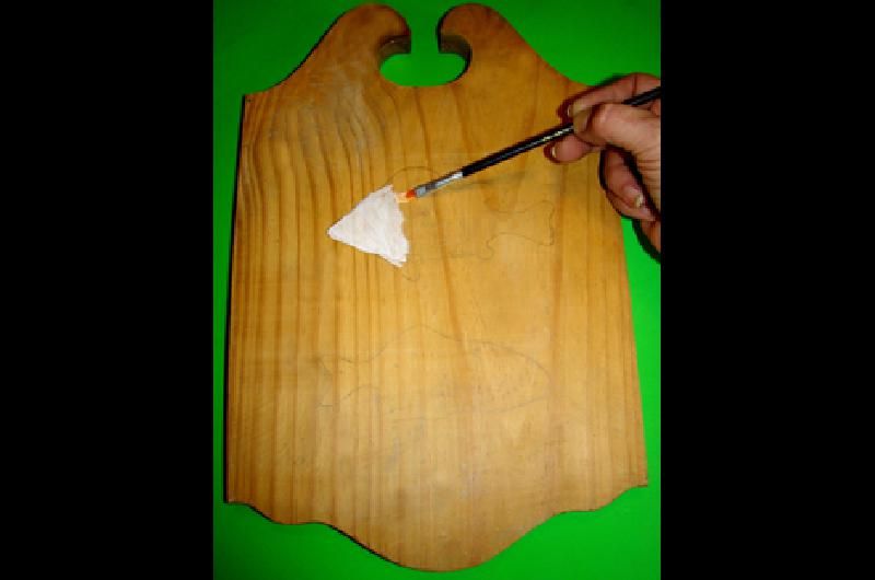 Con un lápiz, marcar las siluetas de los peces sobre la pieza de madera, sobre el lugar en que se van a adherir. Pintar estos sectores con acrílico blanco y dejar secar.