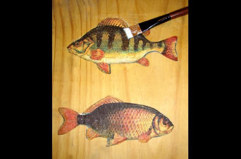 Aplicar cola vinílica sobre las siluetas de los peces. Apoyar las figuras recortadas haciéndolas coincidir. Asentar con el pincel suavemente, desde el centro hacia fuera, evitando arrugas. Pincelar nuevamente con cola vinílica y dejar secar.