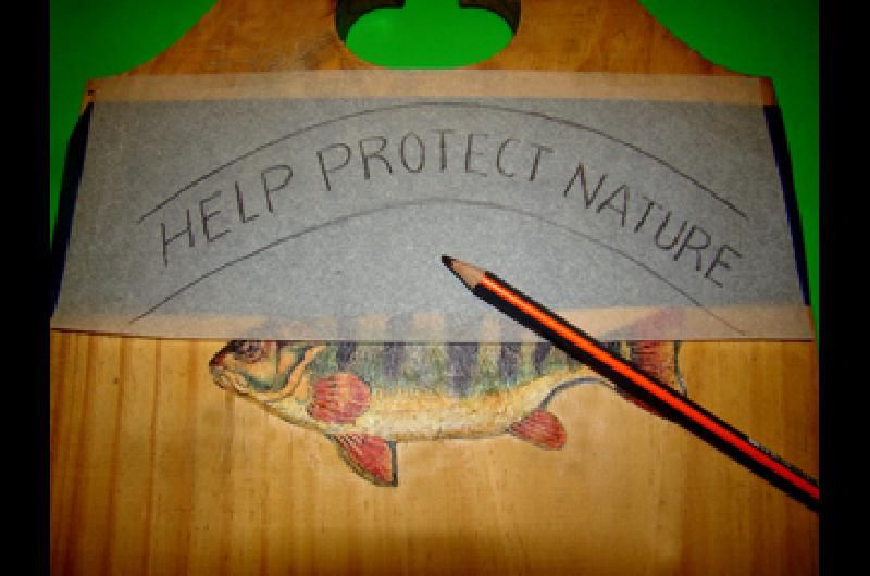 Realizar las inscripciones deseadas sobre papel calco, diseñando el espacio disponible en el cartel. Sujetar el papel sobre la pieza con cinta en el lugar elegido y colocar debajo el papel carbónico. Repasar con lápiz suavemente para transferir las inscripciones.
